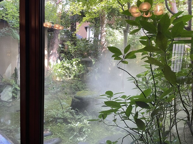 和洋折衷クラシカルな玄関・通路・BAR・カフェ・を通り庭に面したレストランにたどり着く。