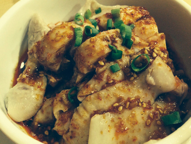 茹でた鷄に辣油、中華醤油、香草、紹興酒