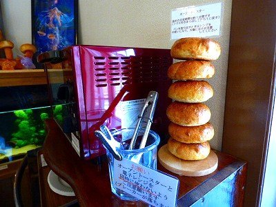 レンジでチンも出来ます。レンジの横に飾ってあるのはベーグルを乾燥させたのだとか。