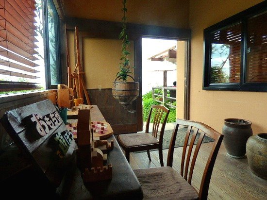入口すぐには木のおもちゃが置いてあって