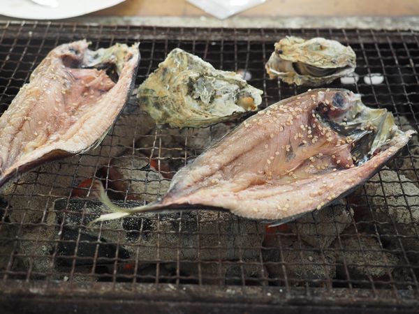 牡蠣1盛り、牡蠣シュウマイ2個、ひおうぎ貝2個、干し鯵2尾で