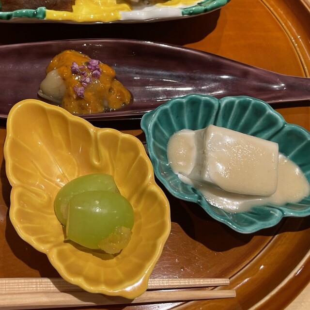 左:伊勢海老 右:ホッキ 奥:玉子豆腐にウニ