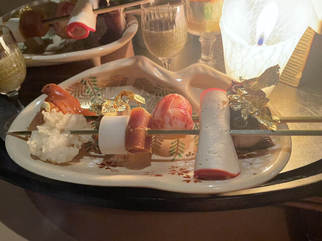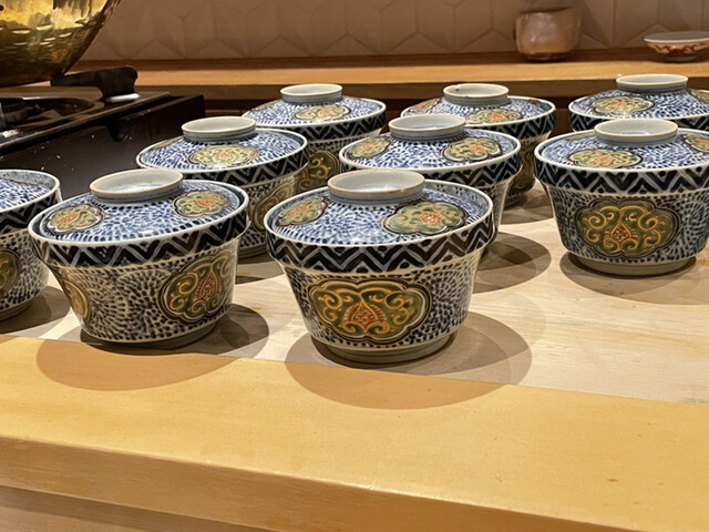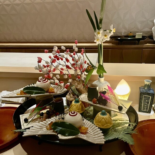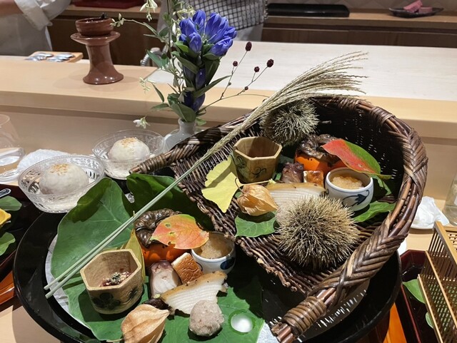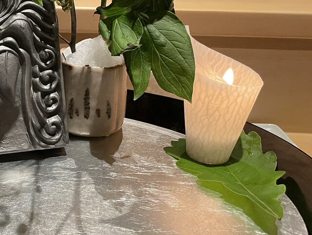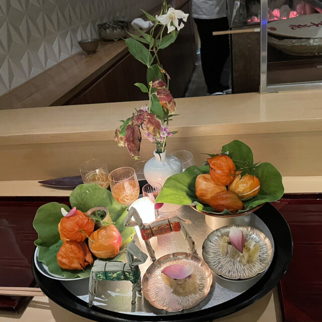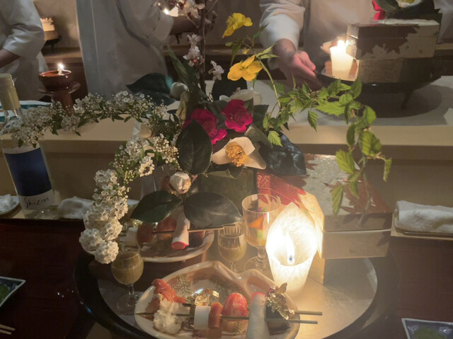 とにかくプレゼンテーションが素晴らしい。各お料理のベストタイミングでの提供、揃っていればこその演出(あかりを灯した八寸提供前に室内の照明を落とす)、これらを低コストで実現するための一斉スタート、と強く納得。