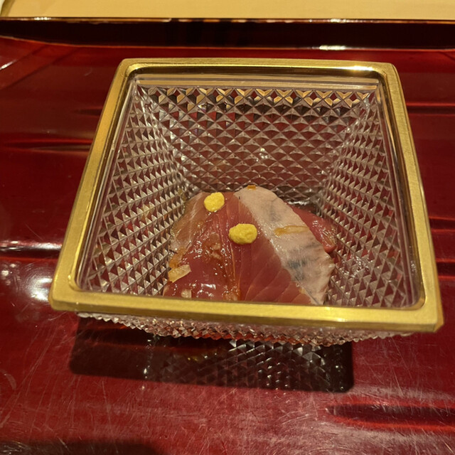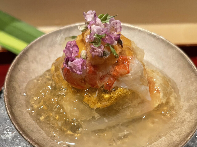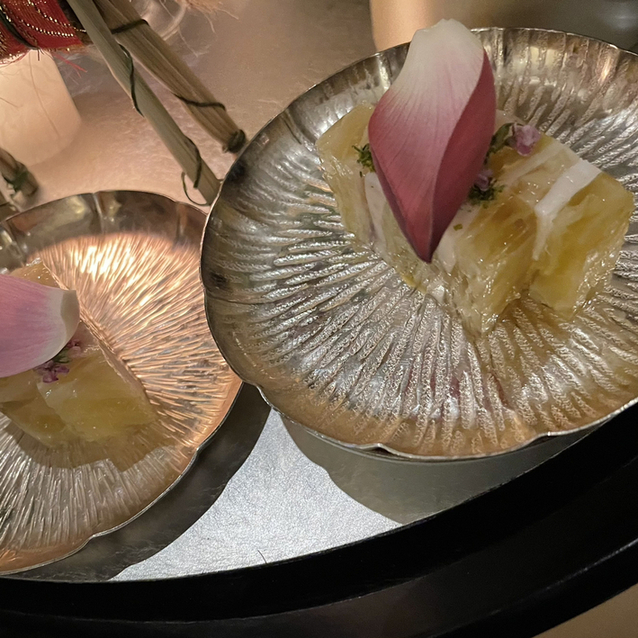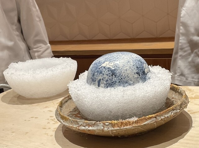○飯蒸し:ガラス器は蓮の葉をイメージして作ってもらったものとおっしゃっていました。蓮の花びらを冠して登場。飯蒸しの中に蓮の実がひとつ、上にスモークしたキャビアと焼きキス。キャビア、スモークしたら美味しいんだ、と目から鱗。