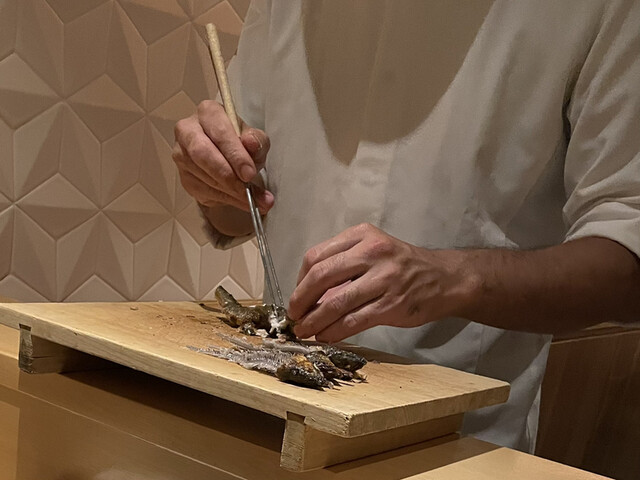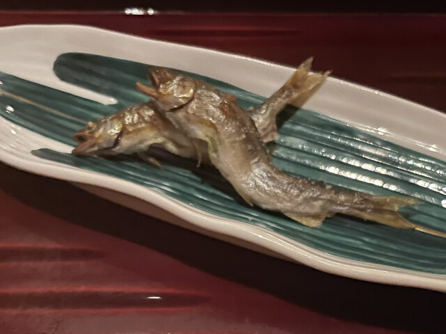 1月前に犬上川に小鮎釣りに行った話をしつつ頂きました。そういえば、我々、近年琵琶湖周辺の小鮎を食べて満足し、それ以上大きい鮎をあまり頂いていないことに気付きました。小鮎は頭から頂きます。長良川の鮎はお弟子さんが順次、骨抜きをしてくれます。見事な手早さ。
