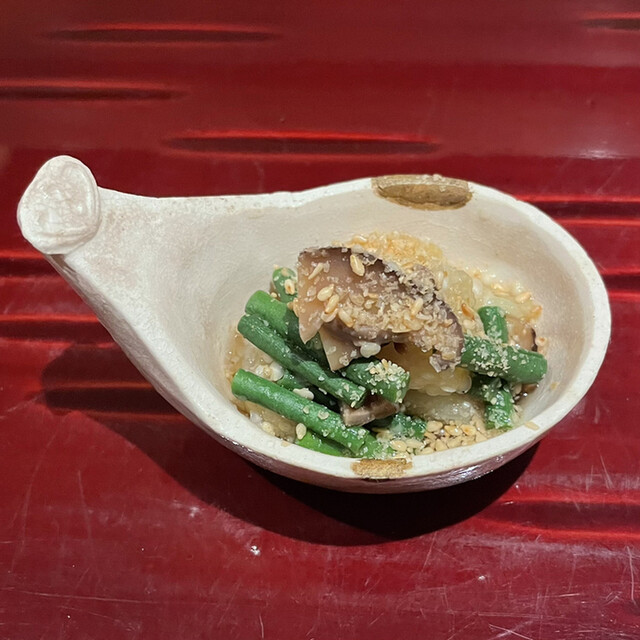 ○和えもの:丸茄子の焼きなす、ドンコ、三度豆、胡麻(いわゆる胡麻和えではありません)。コーススタート前後から炭火で焼いていた丸ナス、何になるのかなあ、と気になっていました。