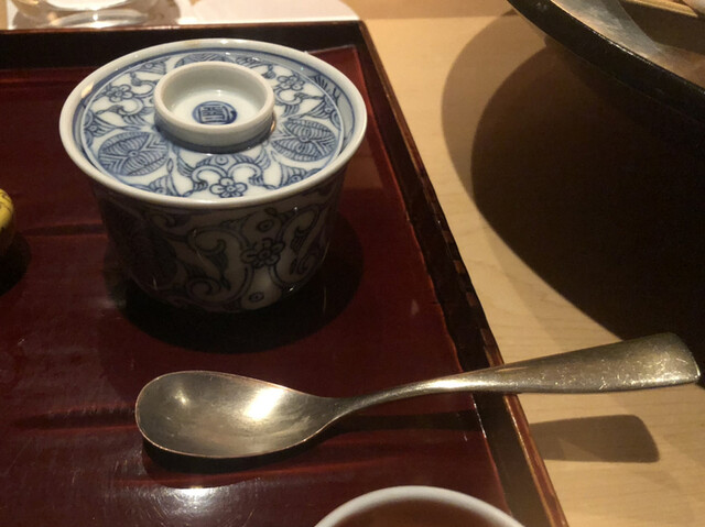 全てをよく混ぜてお召し上がりください、とのこと。白子天麩羅、フォアグラ天麩羅、聖護院蕪、海老芋は良いけど、黒トリュフってどうなるのかしら、と半信半疑ながら言われたとおりによく混ぜます。美味しいです。懸念していたトリュフが主張しすぎることもなく、渾然一体と、冬にぴったりの温かさ。