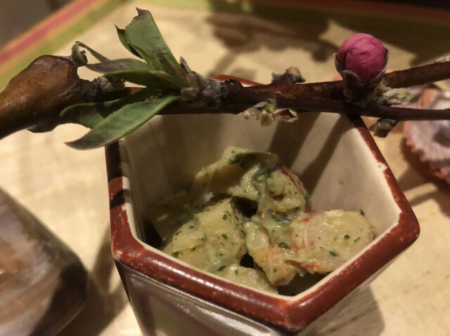 【前菜】 酢の物(白魚・鮑・車海老・帆立貝・蛍烏賊・菜の花・子持ち昆布 加減酢煮凝りで)
