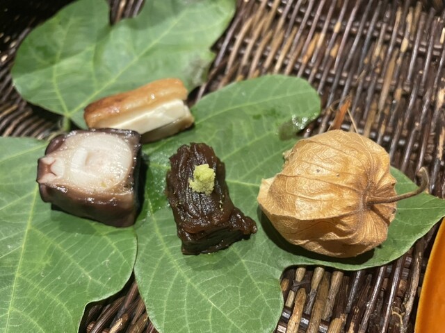 今回は時期としてお盆もひとつのテーマでした。お盆のお飾りを模した八寸は灯籠を連想させる灯りも美しく、ああ迎え火忘れないようにしないと、と厳かな気持ちにもなり感動的でした。日本人でよかった、の瞬間です。