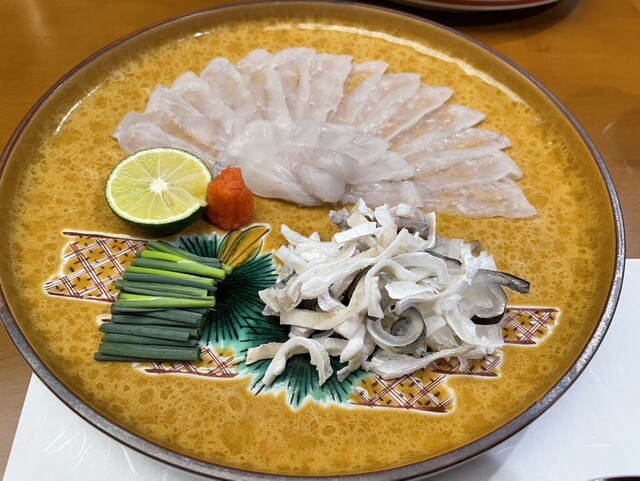 コースでの食事も初めて。基本のコースは7,000円の義経コース。これにふぐが付きました。厚切りで食べ応えあり、1人1人の量がかなり多め。蟹も頂いたので、コースの鰤照り焼きは食べきれませんでした。ごめんなさい。