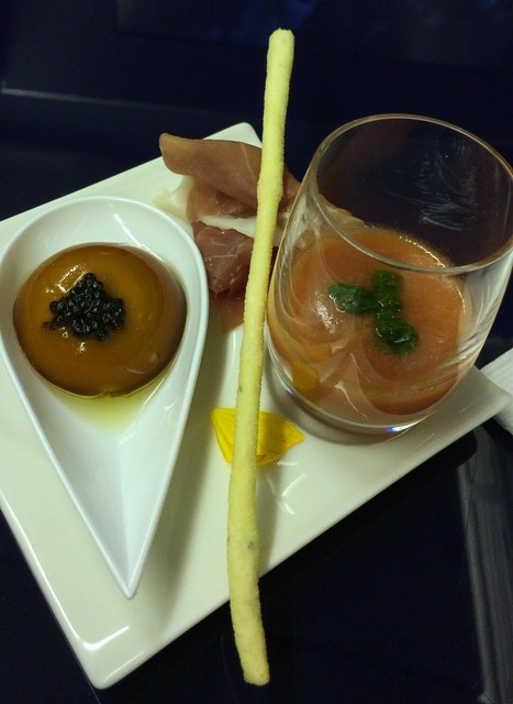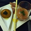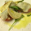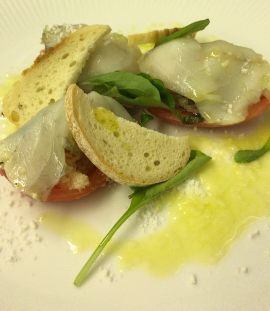 オリーブオイルとバジリコでマリネしたすずきをマンツァネッラにのせて