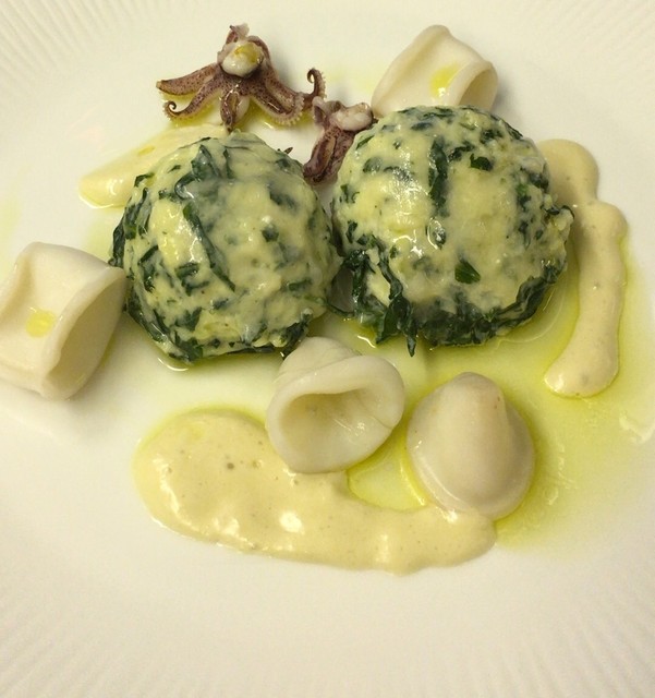 ほうれん草とリコッタチーズのニューディーとやりいか、サルビアのソース