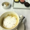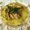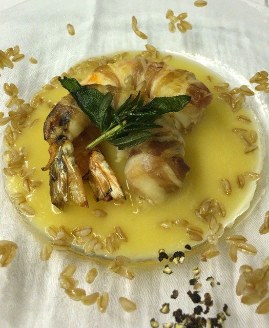 クルマエビのパンチェッタ巻き、スペルト小麦のクリーム香草風味