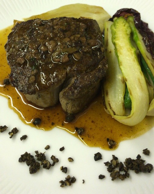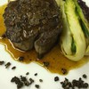 牛フィレ肉のロースト、タジャシュカ種黒オリーブのせ、赤ワインソース