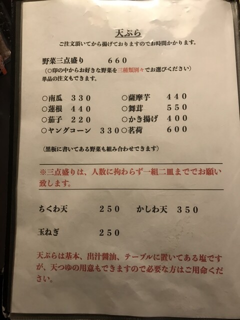 4名様なども多かったこともあり、おひとり様の自分は15分程度で2人掛けのテーブルへ。メニューには「茹でたて揚げたてを提供するのでお時間いただきます」とあり。待ちますとも待ちますとも(笑)