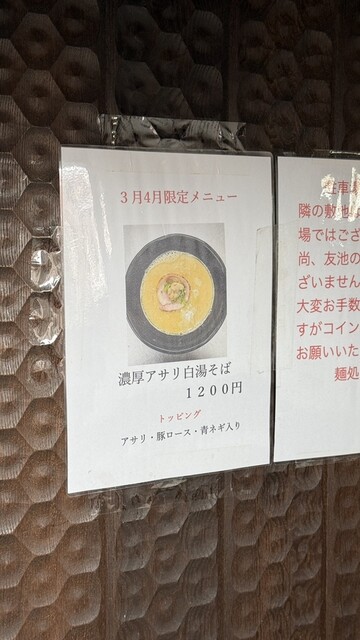 住宅街に佇む、豚白湯スープをメインとする希少なお店。定番メニューも素晴らしいですが、今回は3月と4月限定の「濃厚あさり白湯そば」が目的。先月までの濃厚牡蠣そばが絶品で、同じ作り方の「あさり」ならば間違い無し、必食な一品とさっそく訪問。