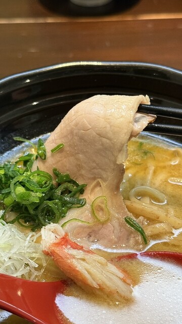 カニにむき身、豚ロースチャーシュー、白髪ネギ、青ネギ。