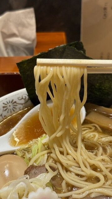 中細ストレート麺。ややウェーブがあり、程よい弾力と小麦の香りで、スープとの絡みもばっちり。