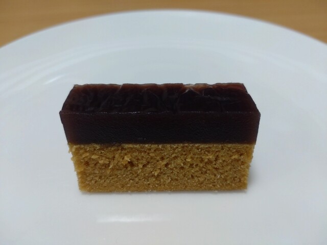 利休と羊羹を2層重ねにしたもの。利休巻きでおなじみのしょうゆを使った和風カステラ。