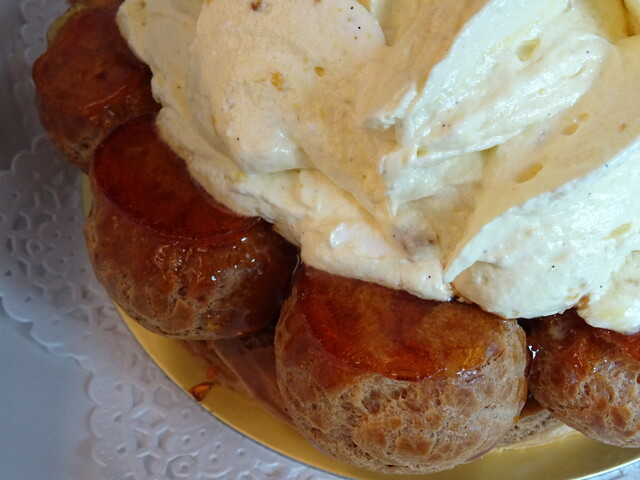 このクレーム・シブーストは、かなり甘い。さらに量も多い。外側には小さなシューを1周付けているが、その下のベースもまたシュー生地。かなり硬いけど。あめ掛けしてあり、甘苦い。