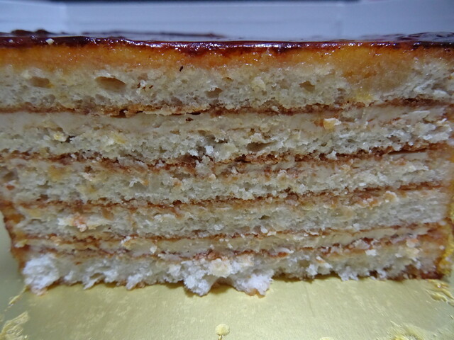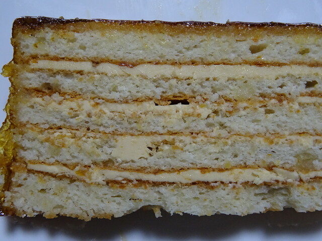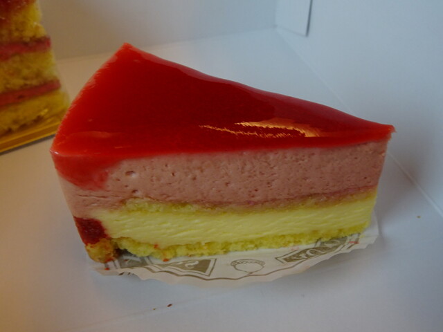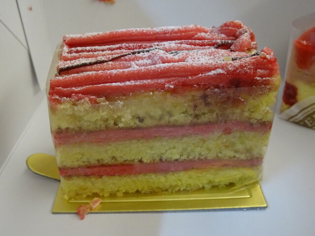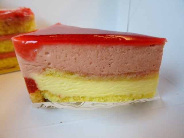 アーモンドパウダーを使ったぼそぼそとした重たいアーモンド生地にピンク色のフランボワーズ入りバタークリームを塗ったもの。重たいケーキ。