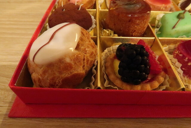 事前に電話で予約し、17時に受け取りに行った。平日なので、プティ・ガトー(小さい生菓子)は2種類だけあった。あとはアントルメ2種類。アントルメは、夜に行ってもまだ残っていることがある。