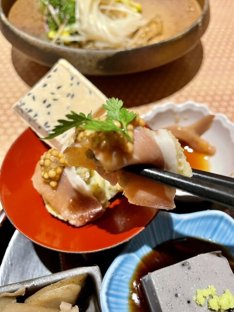 子和え、数の子と姫筍の青森風浸し豆、豊盃の酒粕入り津軽豚の和風パテ、イカとれんこんごぼうの田舎煮、