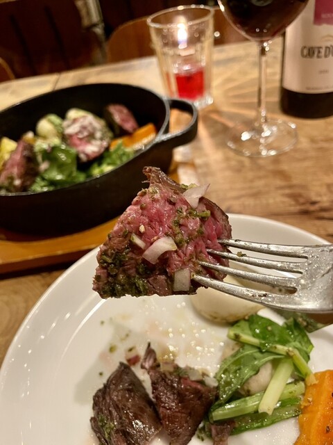 ガーリックバターのシンプルな味付けで、素材の良さと美味しさを楽しめます。ハラミの弾力のあるジューシーな食感と、赤身の旨味とほどよい脂の甘みのバランスの良さ。野菜も大きくカットされていて香りよく美味しい!