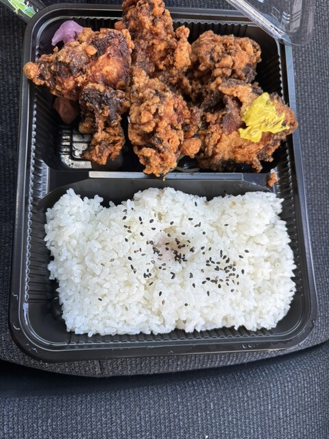 黒唐揚げ弁当カラシ付けて食べると最高なんだなぁ〜