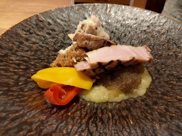 宮崎綾豚を2時間低温調理、ナスの裏ごし、牛肉のポテトサラダ、鶏そぼろ