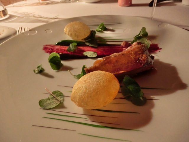鳩のロースト。ミディアムにて。いい焼き加減。ラズベリーの酸味のあるソースと野草のピュレ