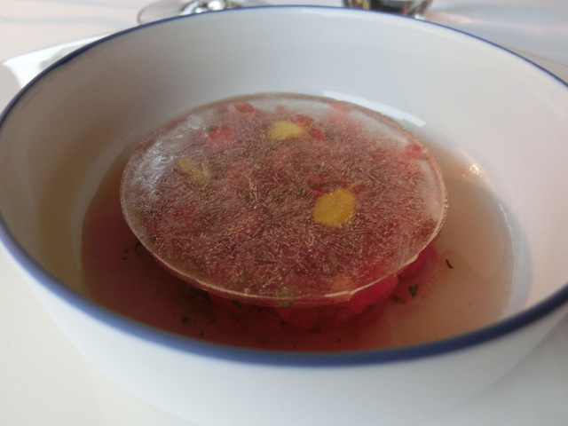 トマトと圧力をかけて抽出したトマトの液体。酸味のある液体はとろみがあります。上の氷を割りながら、食べる塩梅がいいですね