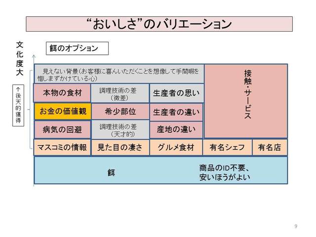 そして、人間の成長にしたがい、人との食文化との出会い、つきあいを通して、後天的に自動車のオプションのように“おいしさのバリエーション”として付け加えられていくと考えます。