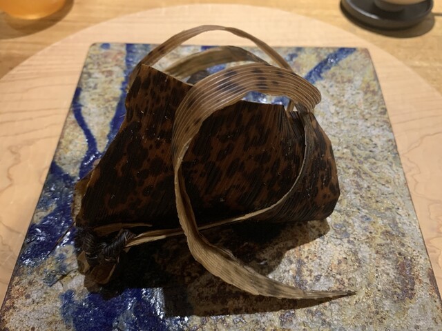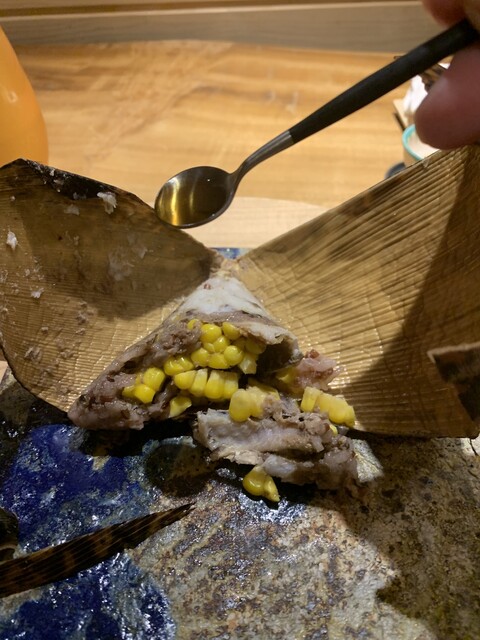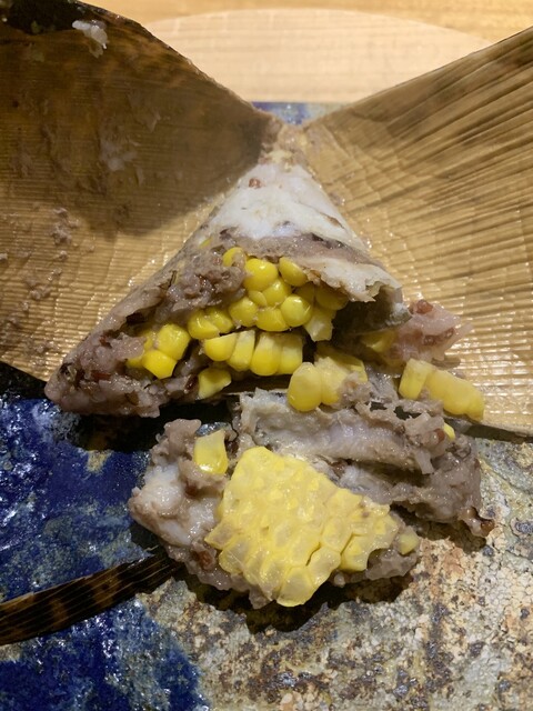 肝はペーストに。とうもろこし、赤米黒米もち麦、鮎身、肝、をまとめて竹皮で包み蒸しあげています。自家製鮎魚醤をお好みでかけるとうまい。