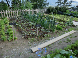 今日は冷蔵庫代わりの菜園の前の席でお勉強です。