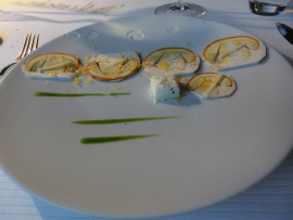 やはりジェネバ湖から~さくっとしているけどふわふわなアンコウ(Monkfish)ヴァンブランソースをベースにした酸味にオキザリスの香り