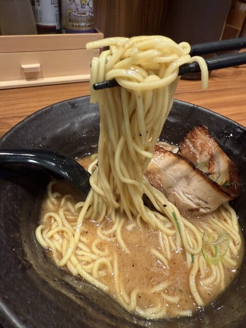スープは見た目、こってりしてそうに思いましたが、見た目ほど重くなく、魚介出汁と豚骨スープがいい具合に重なり合い、やや濃いめの醤油との相性も抜群!実はこの手の豚骨ラーメンはあまり得意ではありませんでしたが、このスープの美味しさには、圧倒されました!