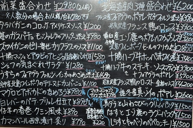 1時間くらいすると、目の前のテーブルに女性2人が来て、グラスワイン、メイン数皿、そのあとボトルワインを頼まれていました。後でワインリストを改めて見ると、道産ワイン数種類のほか、フランス産、イタリア産を中心に、泡、白、赤、オレンジと、どれもリーズナブルなお値段で提供されていてので、道産ワインをボトルで頼むべきだったと思いました。