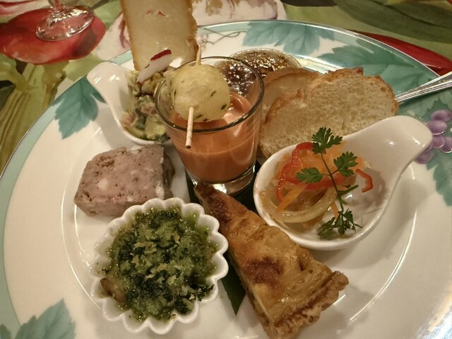 ワインとお通しを食べているお程なく、前菜盛り合わせが来ました。一つひとつ説明を受けましたが、黒板に書いてある本日のメニューの一部から3〜4品、プラス2〜3品が盛られていました。