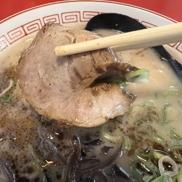 豚骨スープに焦がしニンニク黒マー油が浮く、コクと甘味のある旨旨スープ‼︎麺は細のカタメン提供でコシがあり間違いない!チャーシューも漬け込まれてあり旨くて食いごたえあり。