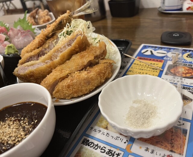 ①ロースとんかつ、アジフライ、山盛りキャベ千
