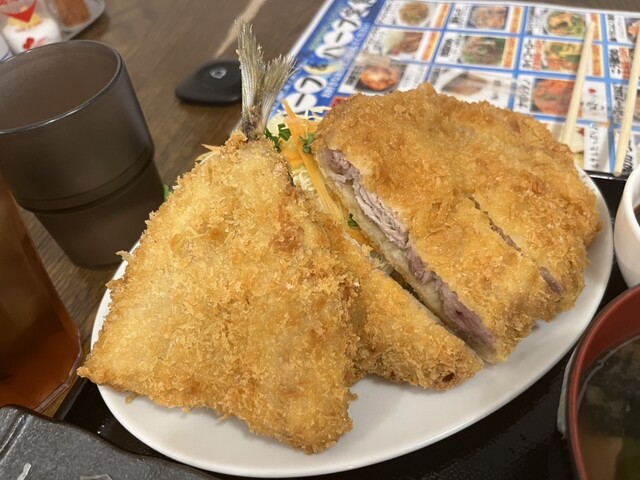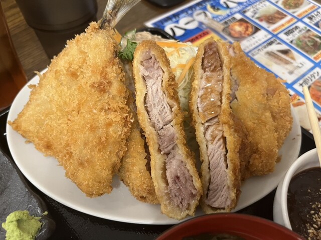 ふわふわのアジフライの身は、ロースカツと喧嘩せずに美味いです。