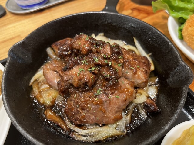 もう一つの鉄板皿は、たぶんマグロのステーキではないかと。