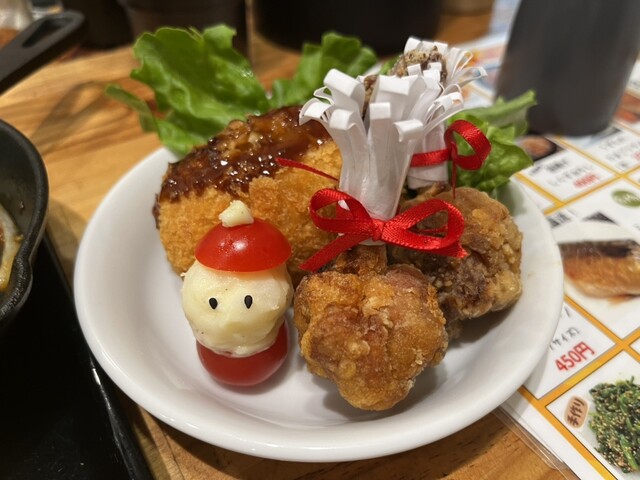 写真1枚目のとおり、鶏のチューリップ揚げ2本、カニクリームコロッケ1個にミニトマトとポテサラで作ったミニサンタさん!