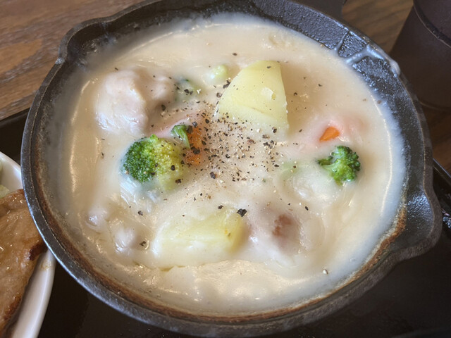 スキレットに盛られて、アツアツでチンチン状態のクリームシチューです。