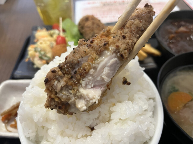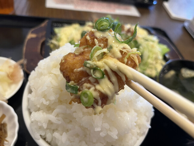 鶏から揚げも周りの料理の中で控えめながら、柔らかジューシーで下味もしっかり肉汁。