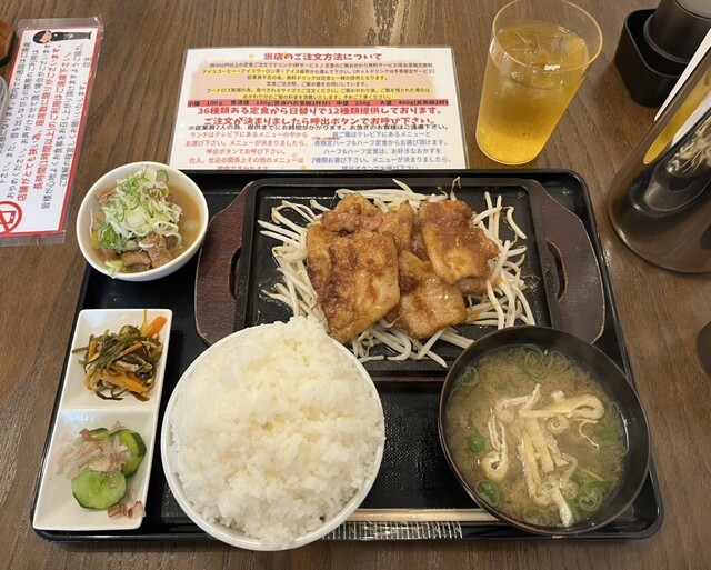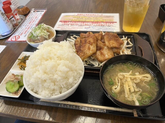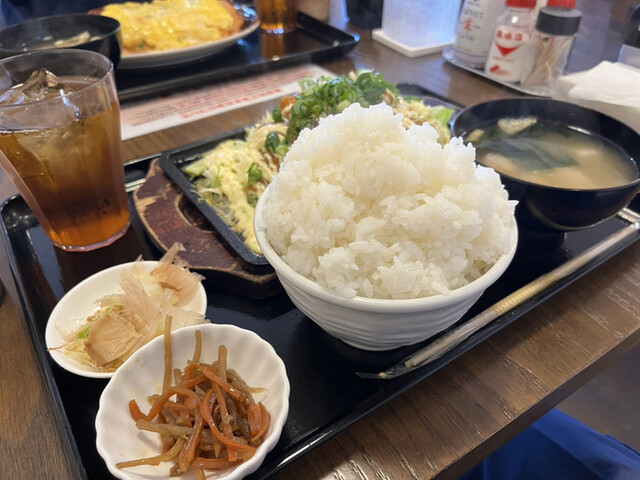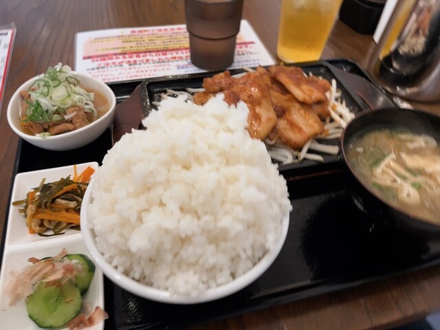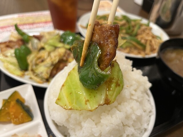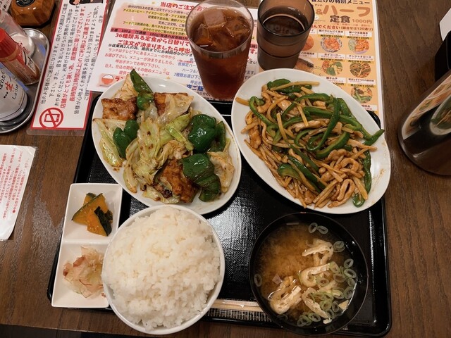 豚バラ肉が重なりますが、甘め味つけでキャベツとピーマンも楽しめる回鍋肉とスタミナ充電にもってこいの鉄板ジュージューのニンニク焼き。
