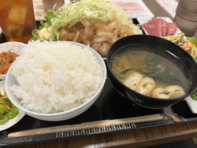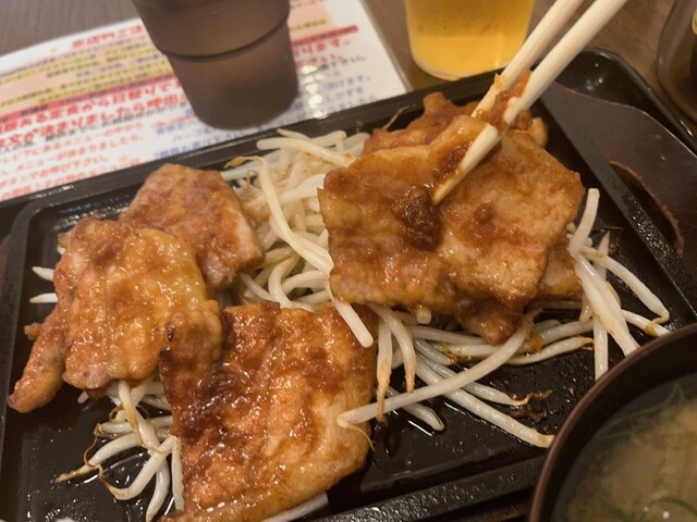 生姜焼きも厚切りの豚ロース肉で、1枚がご飯の上に乗り切らないサイズ。柔らかい。