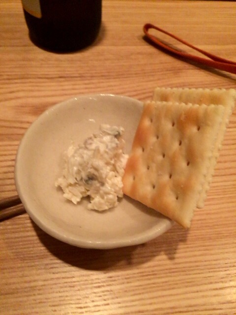 クラッカーにマスカルポーネチーズを白身魚とスパイスで和えたもの。酒の肴は最高。