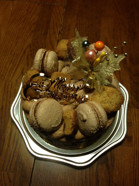 ケーキの上には、マカロンとチョコビスケットが散りばめられています。ナイフを入れると、チョコケーキの間にマーマレードがサンドされているようです。